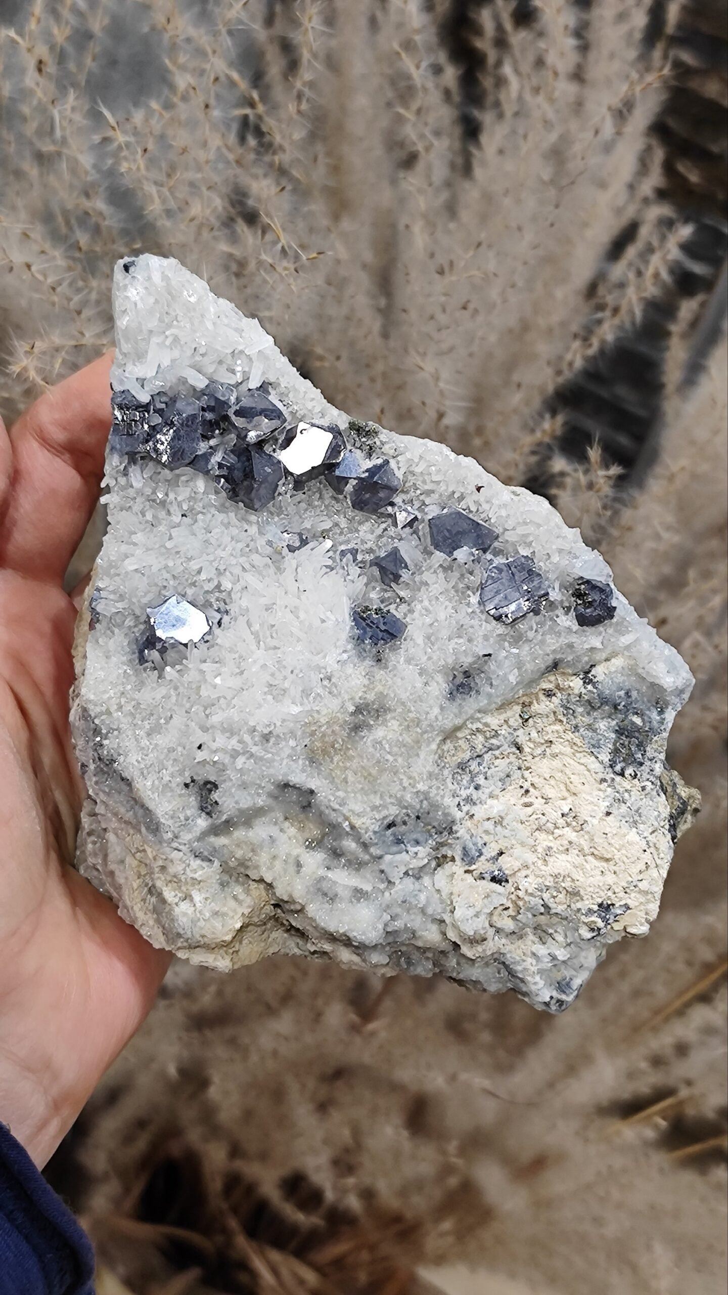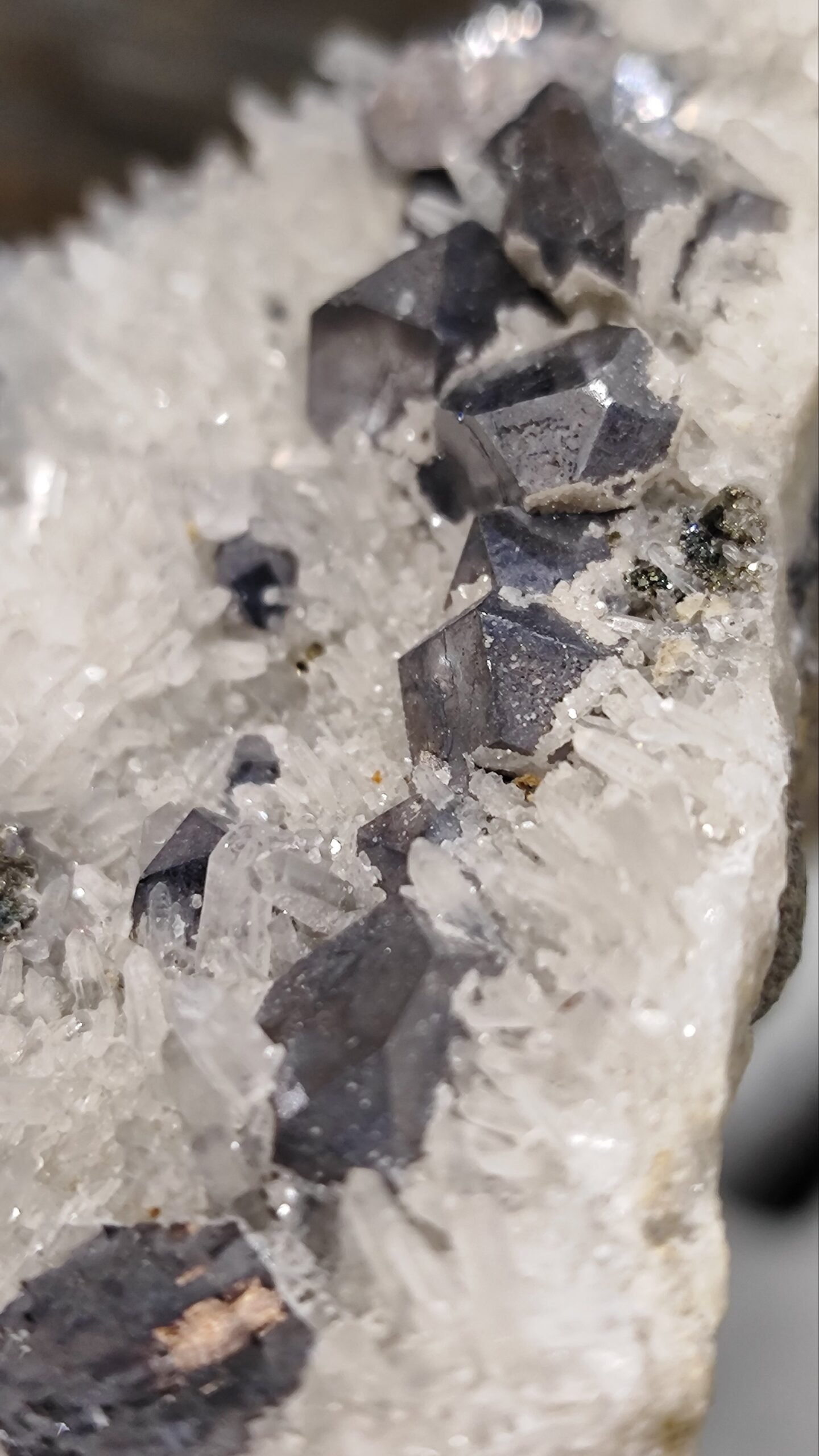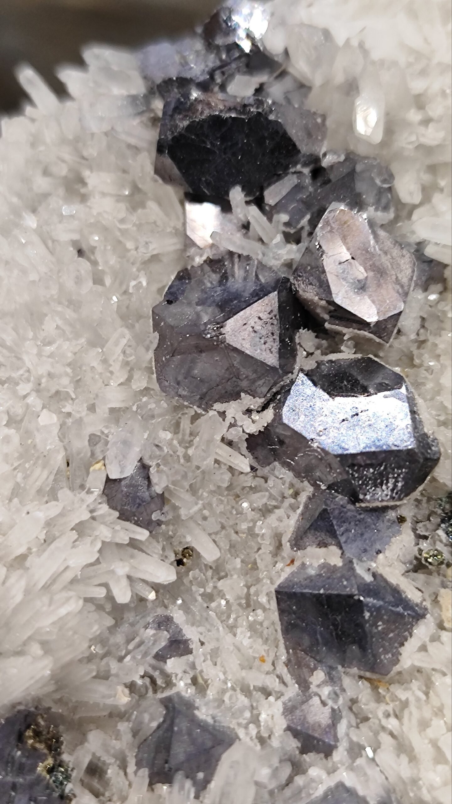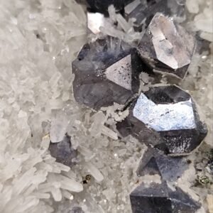 Galenitas: Pilkos spalvos, metalinio blizgesio kristalai. Galenitas dažnai randamas kartu su kvarcu ir gali formuoti kubo ar oktaedro formos kristalus.