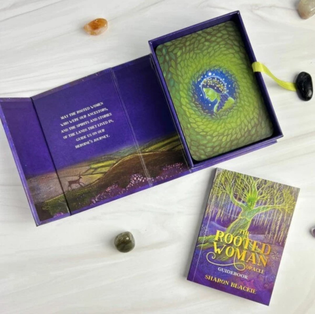 Atraskite transformuojančią paslėpto moteriškumo galią su šiuo nuostabiu orakulu ir atraskite dvasinį maistą, įkvėpimą ir gilesnį ryšį su gamta. „The Rooted Woman Oracle“ yra užburianti 53 kortų orakulų kaladė, kurią sukūrė Sharon Blackie, apdovanojimus pelniusi rašytoja ir tarptautiniu mastu pripažinta mitinės vaizduotės mokytoja. Sekite keliu į neribotą kūrybiškumą, didesnę jėgą ir ištvermę ir sukurkite daugiau srauto savo gyvenime naudodami šį stebuklingą orakulą. Distiliuodama dešimtmečius žinias ir išmintį, Sharon sukūrė unikalų ir magišką orakulą, kuriame susipina trys skirtingos gijos: vietos, sąjungininkai ir kelionė. Nuo įkvepiančio „kalno“ iki tekančios „upės“ patirsite konkrečių vietų archetipines savybes ir pasisemsite dvasinės stiprybės iš žemės. Jausitės palaikomi moterų iš keltų mitų ir folkloro – jūsų sąjungininkės – kaip iniciatorius Ceridwen ir The Cailleach, laukinės gamtos gynėjas; ir rasite Kelionės korteles, kurios atspindi skirtingus herojės kelionės etapus ir padės eiti savo unikaliu mitopoetiniu keliu per gyvenimą. Įsišaknijusios moters orakulas padės jums atnaujinti sakralų ryšį su gamta, susigrąžinti savo galią ir rasti autentiškus bei prasmingus buvimo šiame pasaulyje būdus.