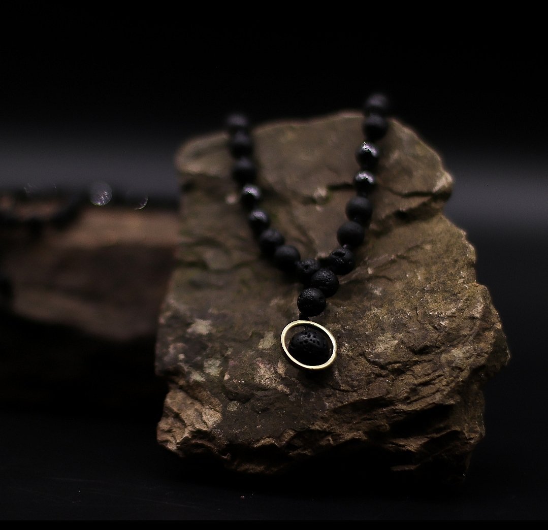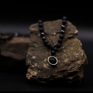 Juodas presuotas gintaras su granato intarpėliais